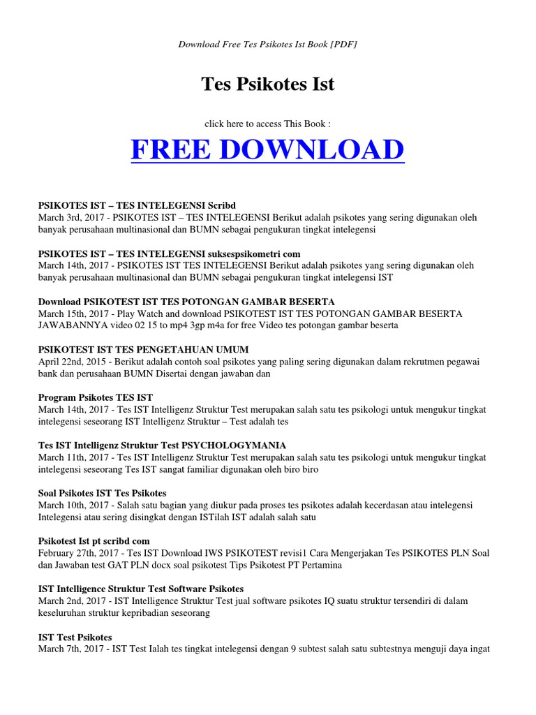 Dan tulis jawaban saudara pada kotak yang telah disediakan. Das ist das neue ebay. Psikotes ist intelligence structure test merupakan tes yang menyeluruh dimana bagian tes satu sama lain saling berhubungan secara struktur. Bukan rahasia lagi lho kalau soal psikotes yang dipakai hampir seluruh perusahaan bonafit di indonesia ini pake soal psikotes ui ist. View soal dan jawaban psikotest ist research papers on academia edu for free.